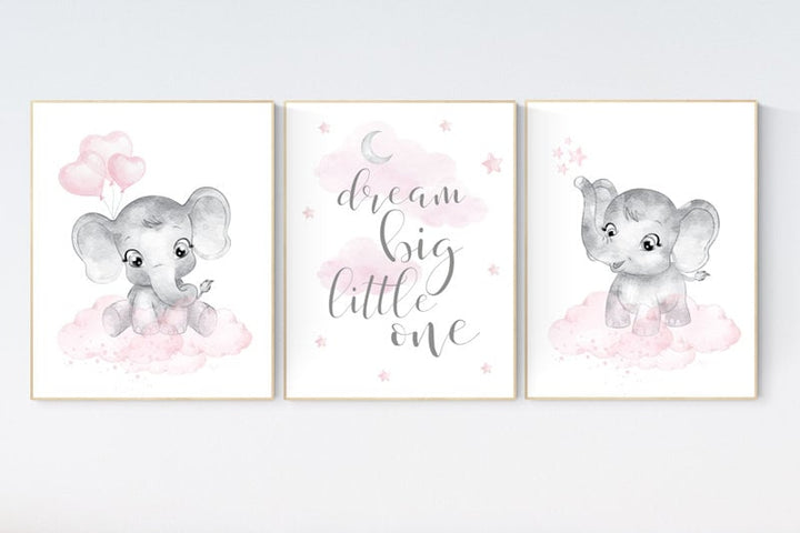 nursery decor elephant girl, baby room decor girl, nursery wall art elephant, pink gray, nursery prints elephants, dream big little one