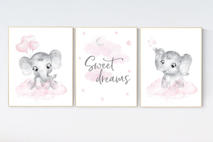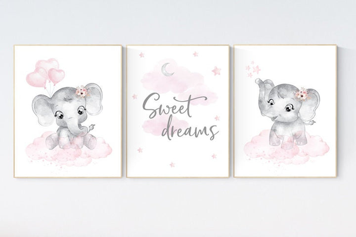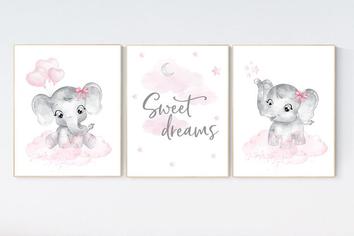 Nursery decor elephant girl, nursery wall art elephant, pink gray, nursery prints elephants, pink grey, elephant nursery wall art, set of 3