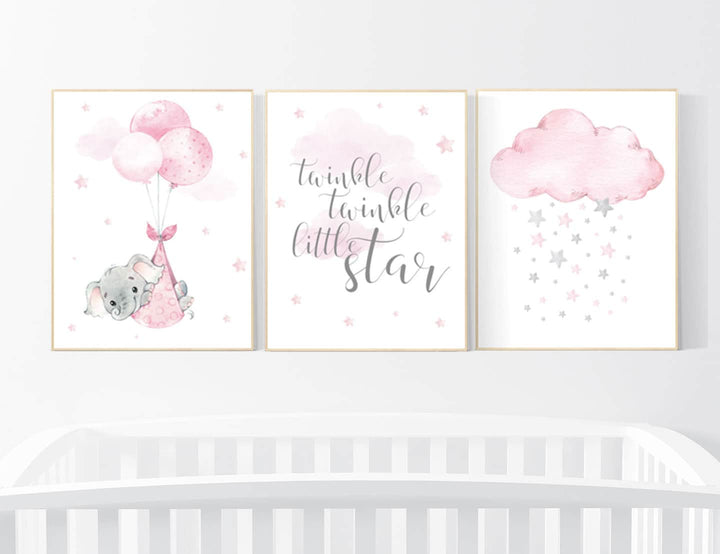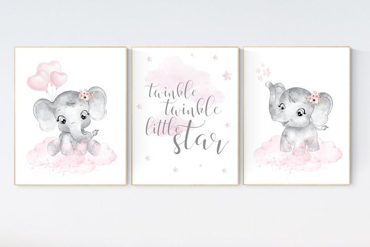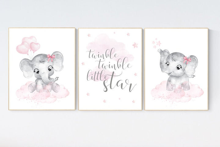 Nursery decor elephant, baby room decor girl, nursery wall art elephant, pink gray, nursery prints elephant, twinkle twinkle little star