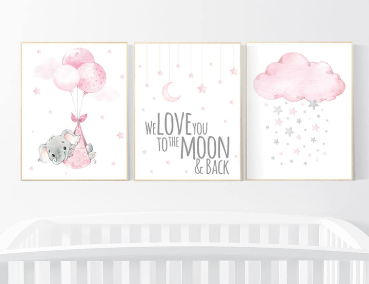 Nursery decor elephant, baby room decor girl, nursery wall art elephant, pink gray, nursery prints elephant we love you to the moon and back