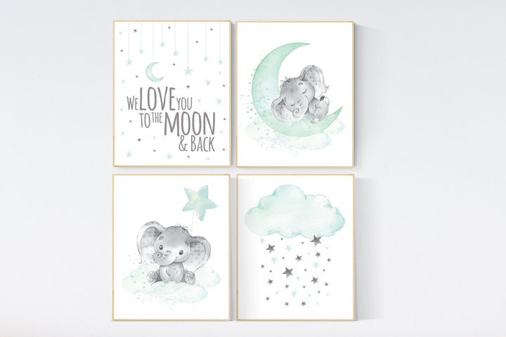 Nursery decor elephant, gender neutral, mint and gold nursery, we love you to the moon and back, mint gold, mint green, nursery wall decor