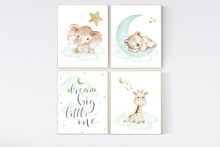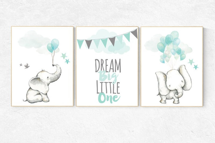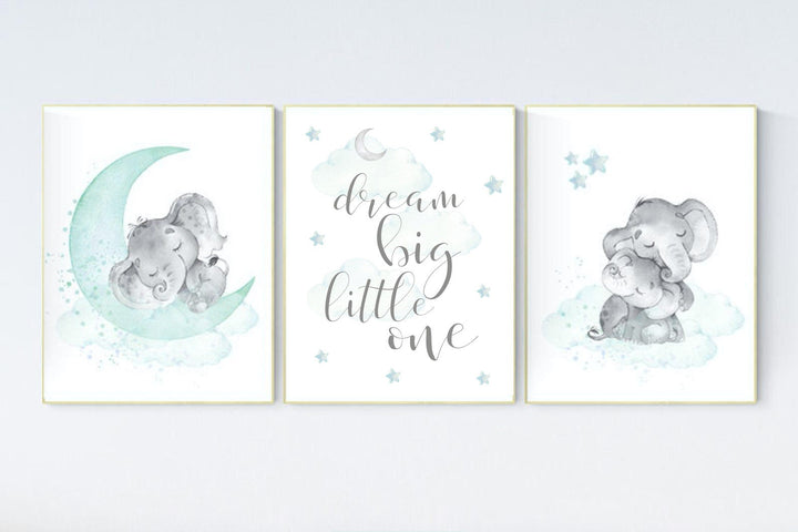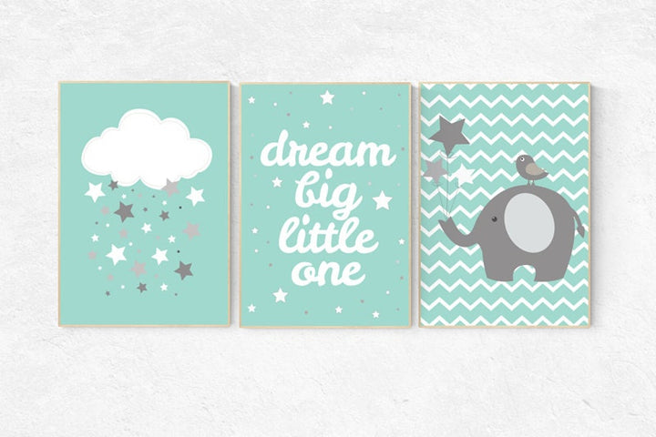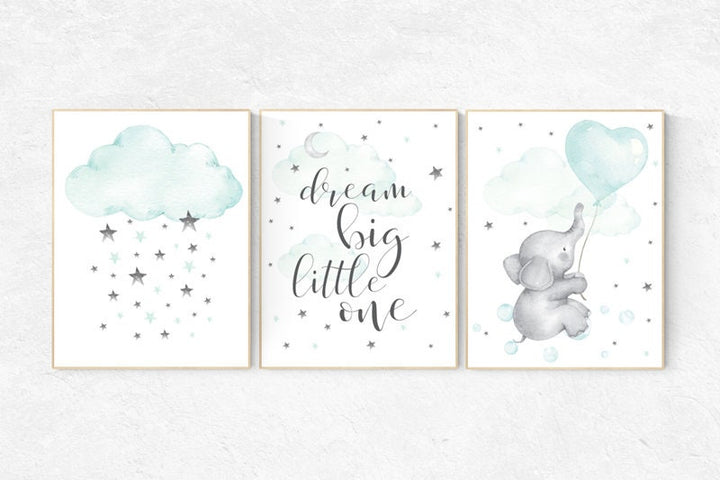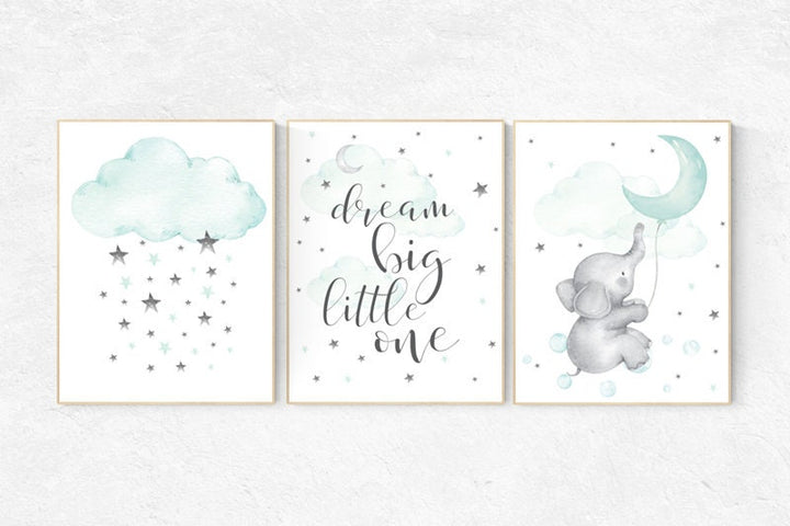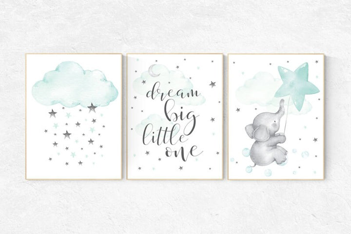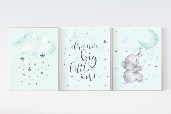 Nursery decor elephant, Mint nursery decor, dream big little one, gender neutral nursery, cloud and star nursery, elephant nursery prints