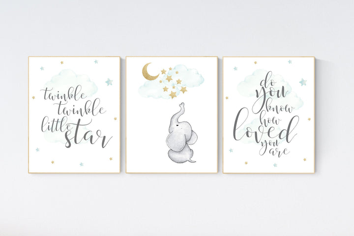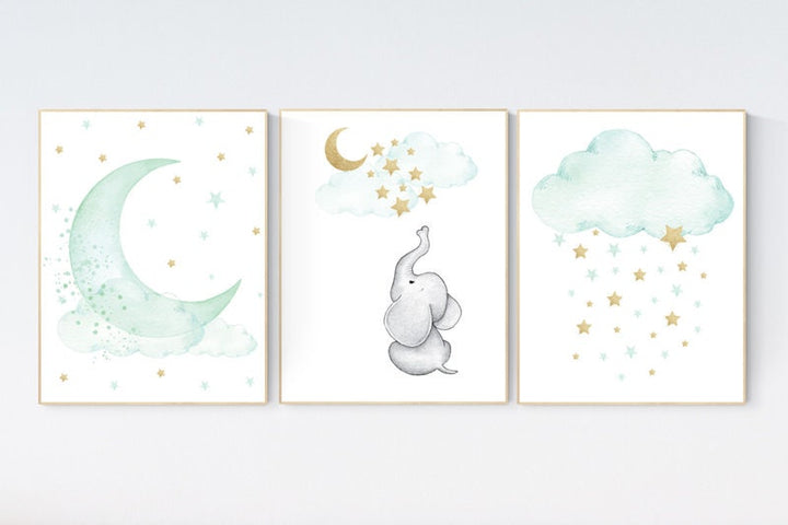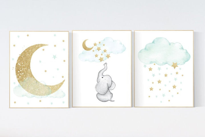 Nursery decor elephant, mint gold baby nursery, nursery decor boy and girl, cloud and star nursery, moon nursery decor, gender neutral