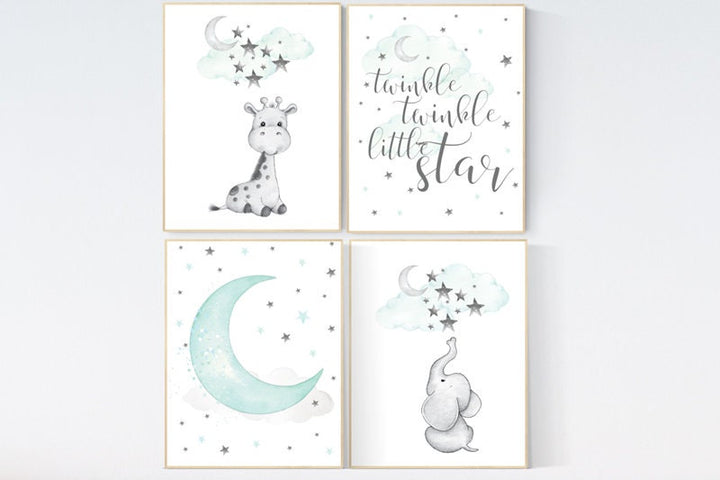 Nursery decor elephant, giraffe, bear, nursery wall art gender neutral, Mint nursery decor, nursery decor twins, mint green nursery prints