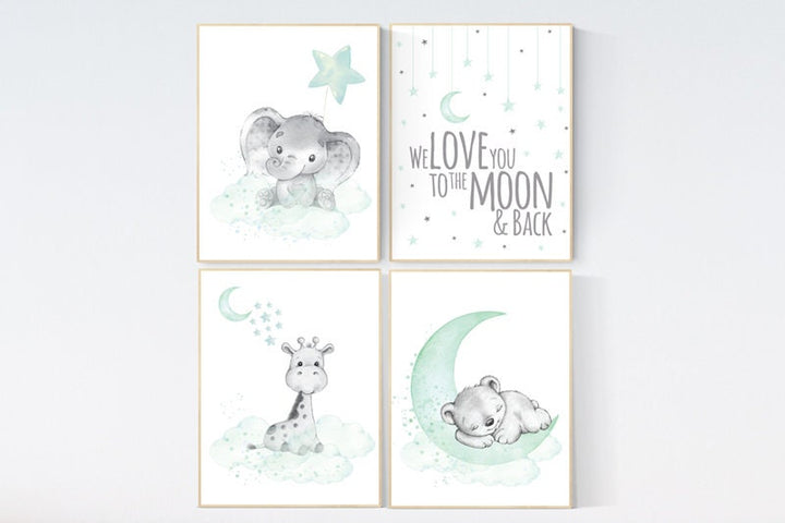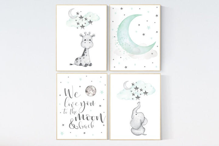 Nursery decor elephant, Giraffe nursery decor, Nursery decor girl giraffe, Mint nursery, gender neutral, we love you to the moon and back