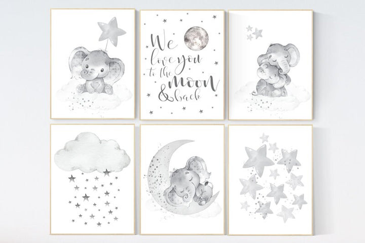 Nursery decor elephant, gray nursery decor, we love you to the moon and back, moon and stars, grey nursery art, elephant, gender neutral