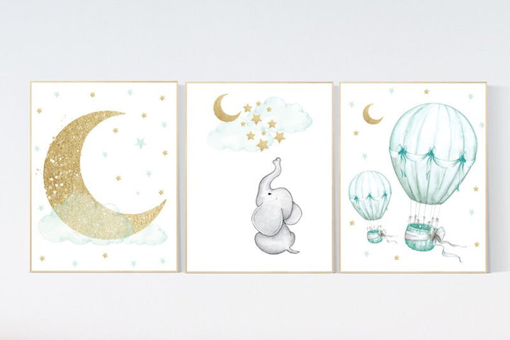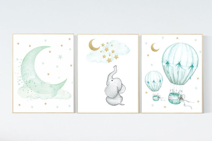 Nursery decor elephant, Mint nursery decor, hot air balloon, gender neutral nursery, nursery decor turquoise, mint green nursery wall art