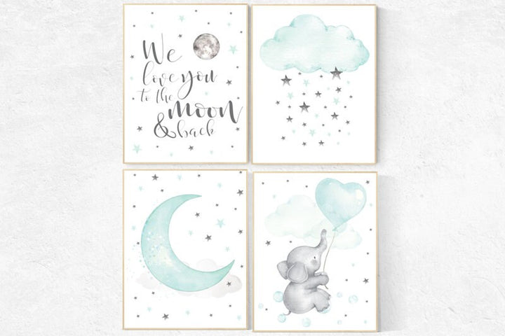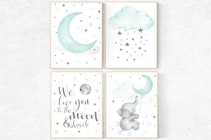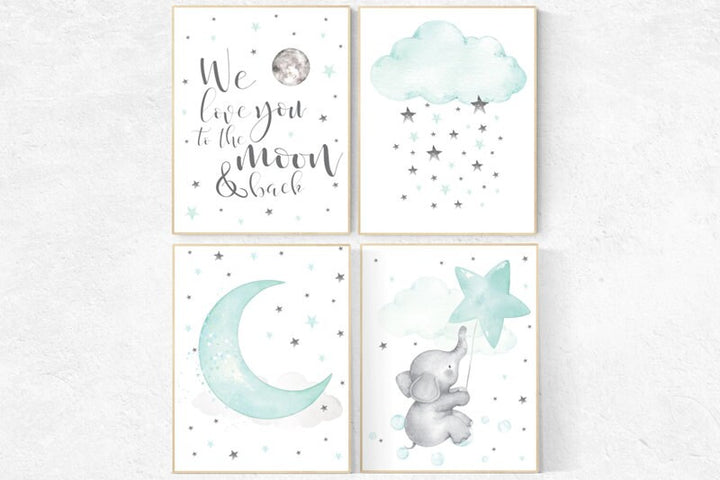 Nursery decor elephant, Mint nursery, gender neutral nursery, we love you to the moon and back, mint green nursery wall art, cloud and star