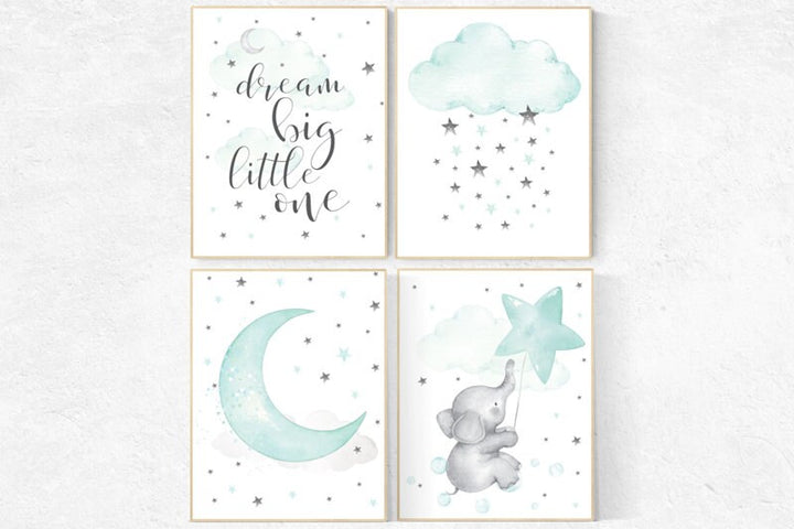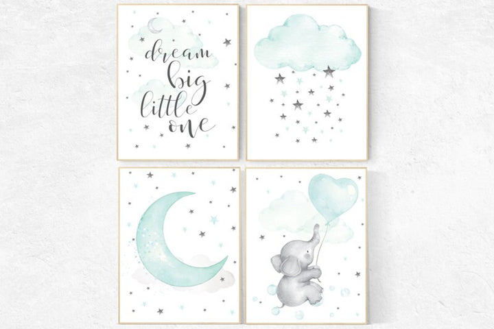 Nursery decor elephant, Mint nursery, gender neutral nursery, dream big little one, nursery decor woodland, animals, moon nursery art, cloud
