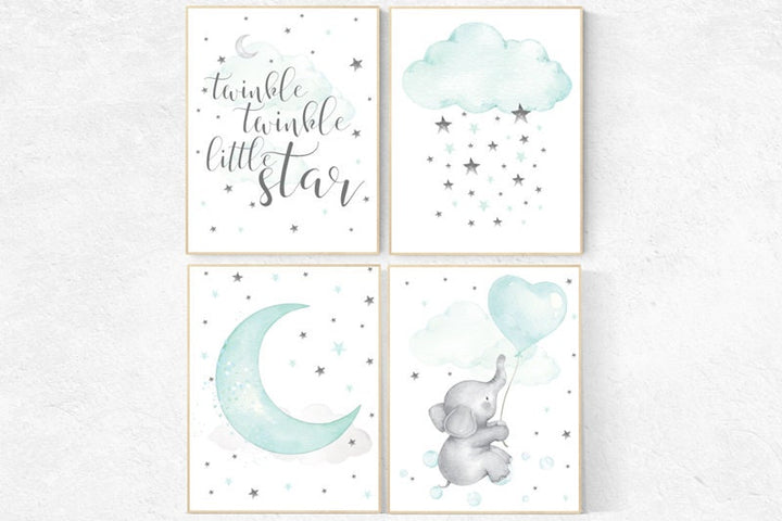 Nursery decor elephant, Mint nursery, gender neutral nursery, twinkle twinkle little star, elephant nursery, cloud and star nursery wall art