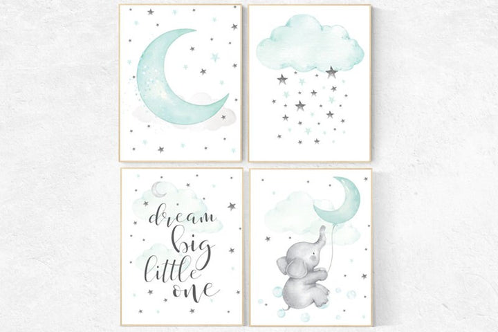Nursery decor elephant, Mint nursery, gender neutral nursery, dream big little one, mint green nursery wall art, moon nursery art, turquoise