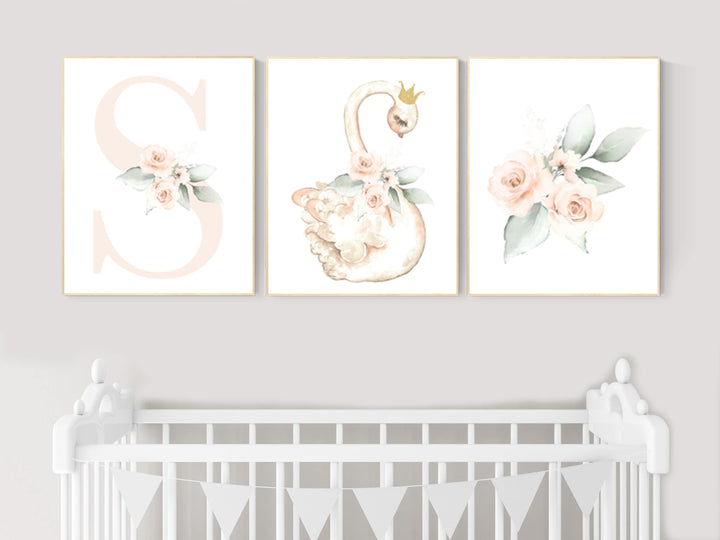 Nursery decor girl blush pink, swan nursery wall art, blush nursery, floral nursery, swan print