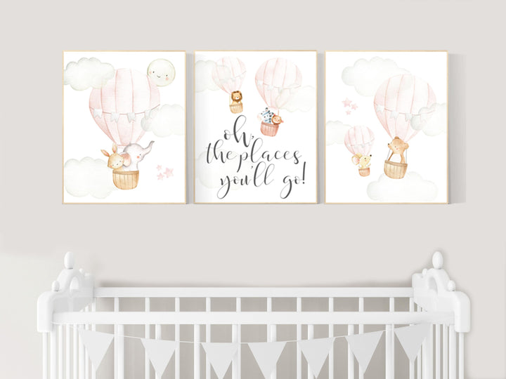 Nursery decor girl blush pink, nursery wall art hot air balloon, animal prints, nursery wall decor woodland animals, girl nursery ideas