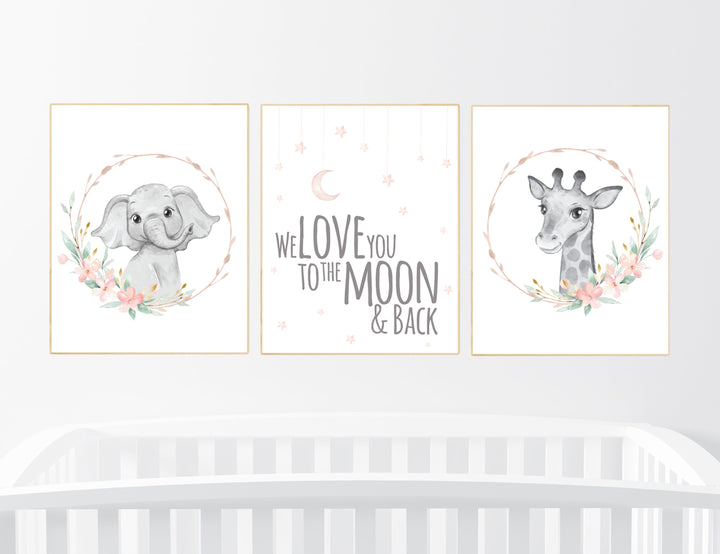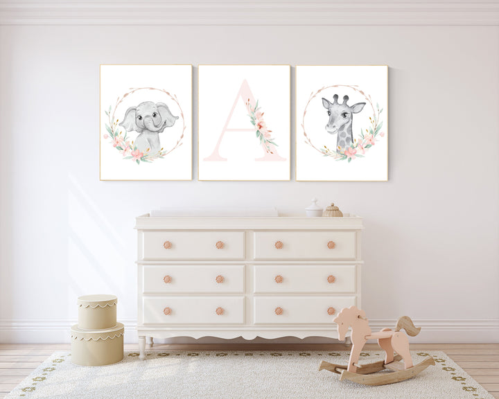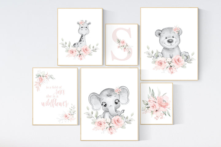 Nursery decor girl boho, animal nursery, blush nursery, blush pink, floral nursery prints, elephant nursery, giraffe, girl nursery