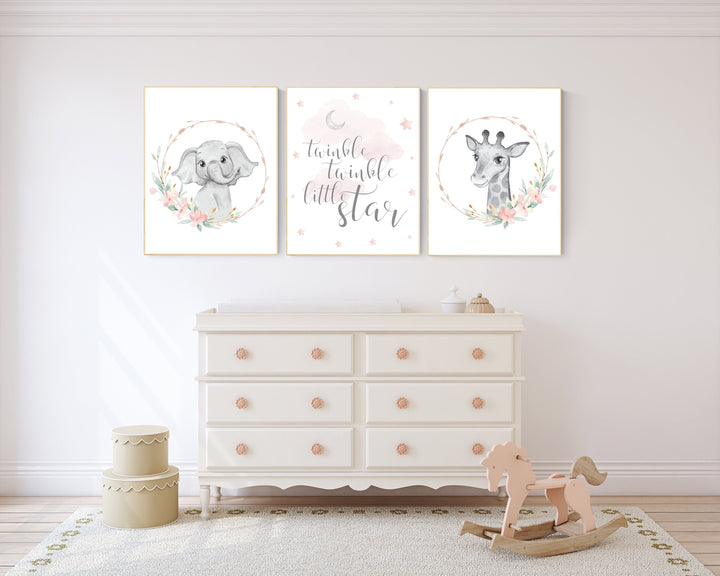 Nursery decor girl boho, animal nursery, blush nursery, blush pink, floral nursery prints, elephant nursery, giraffe, twinkle twinkle