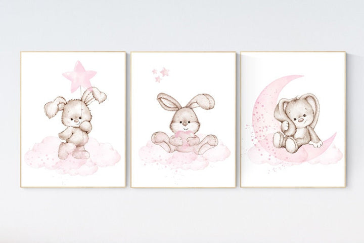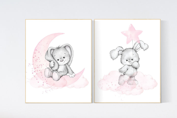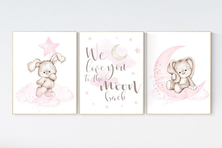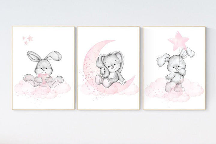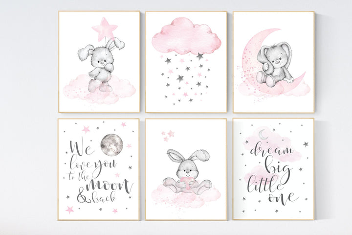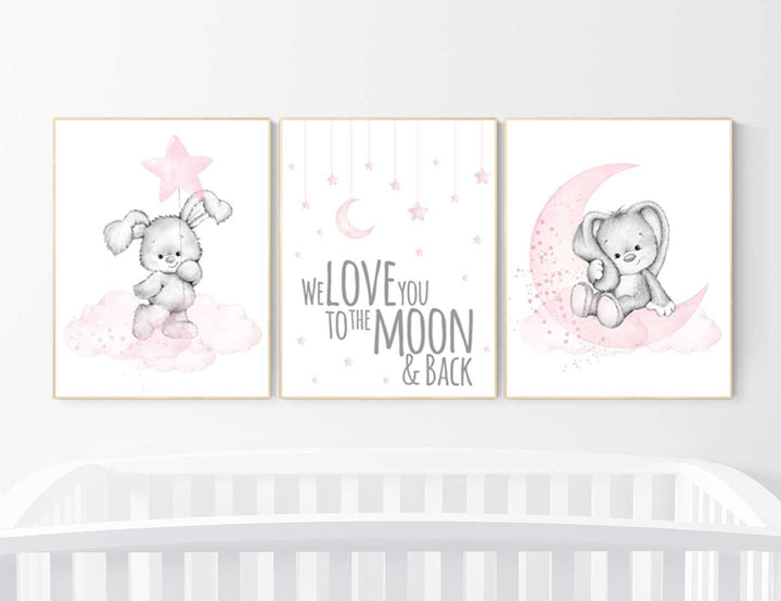 Nursery decor girl bunny, Bunny nursery decor, pink nursery, nursery prints animals, we love you to the moon and back, cloud and stars