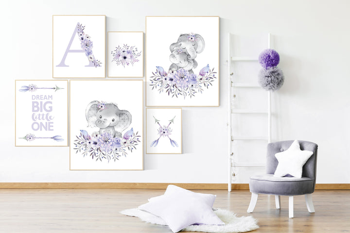 Nursery decor girl boho, Purple nursery, nursery wall art elephant, nursery decor girl, nursery decor girl floral, lilac nursery, lavender