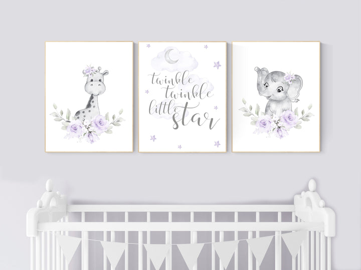 Nursery decor girl boho, Purple nursery, giraffe, elephant, Floral jungle animals, lavender, flower nursery prints, lilac, animal prints