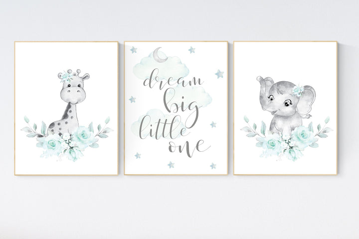 Nursery decor girl boho, turquoise nursery, giraffe, elephant, Floral jungle animals, turquoise, flower nursery prints, animal prints