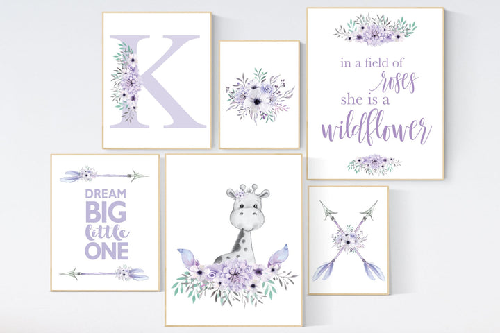 Nursery decor girl boho, purple teal nursery, nursery decor girl flower, nursery wall art giraffe, lilac nursery, lavender nursery wall art