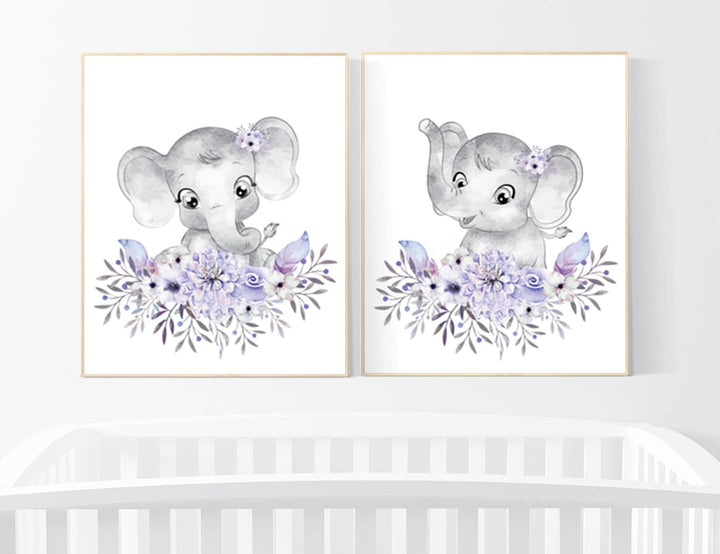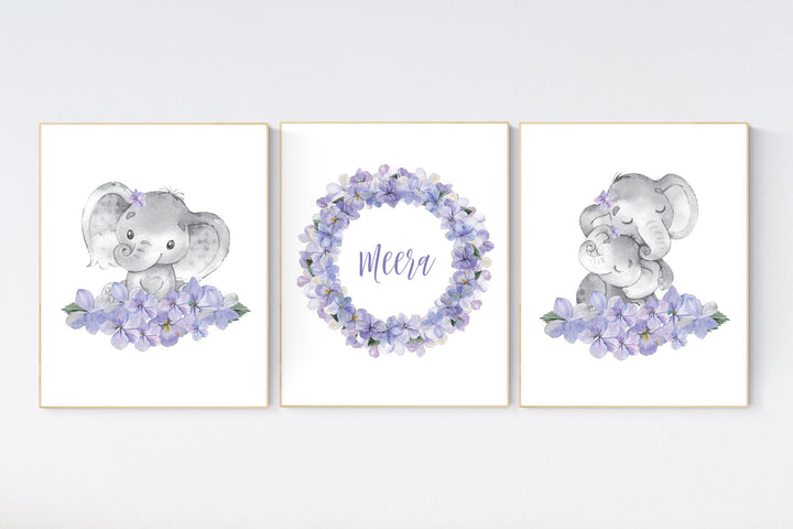 Nursery wall art elephant, nursery decor girl purple, nursery decor girl floral, lilac nursery decor lavender, Boho baby room, lilac nursery