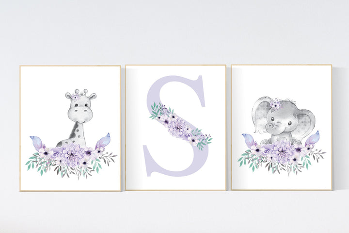 Purple teal nursery, Boho baby room, nursery wall art elephant giraffe , nursery decor girl, nursery decor girl floral, lilac, lavender