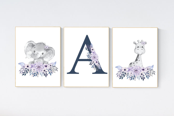 Boho nursery, navy and lilac, purple navy, elephant and giraffe, nursery decor girl purple, nursery decor girl floral, lavender navy