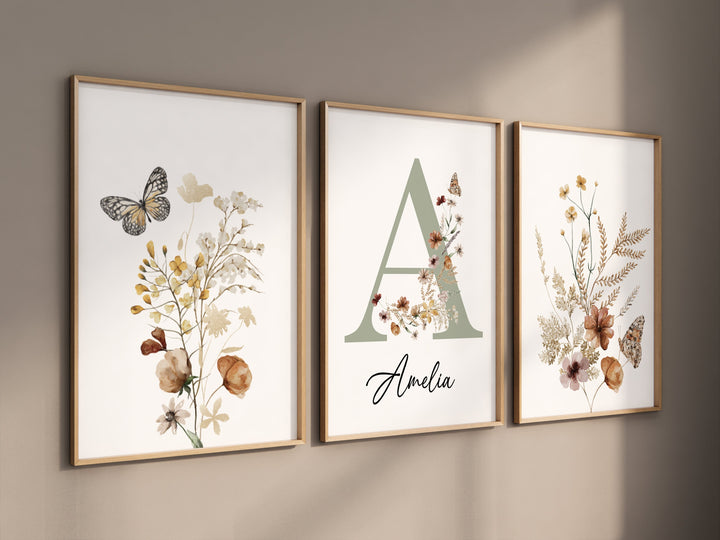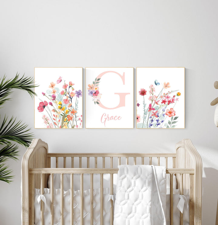 Flower nursery, wildflower nursery, butterfly nursery, Girl bedroom art, name print, girls room decor, blush nursery, baby girl wall art