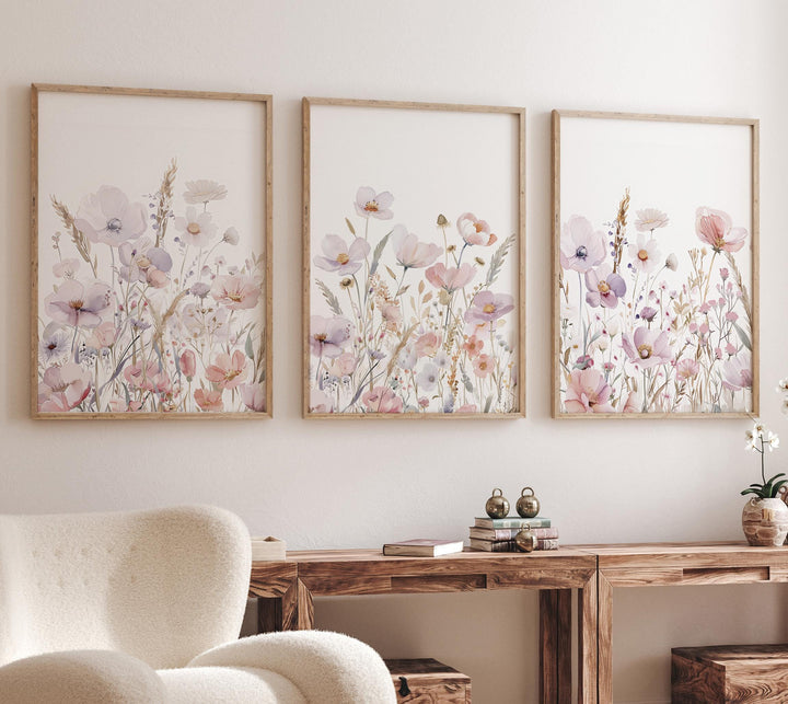 Blush Wildflower Wall Art Set, Neutral Watercolor Floral Prints, boho nursery, Botanical Art, Modern Bedroom or Living Room Decor