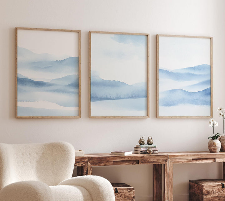 Blue Watercolor Mountain Wall Art – Tranquil Landscape Prints Set of 3, Modern Abstract Nature Artwork, Calming Blue Horizon Decor