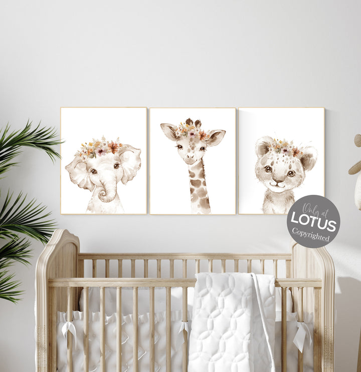 Floral Safari Nursery Wall Art Set of 3 | Lion, Elephant, Bear Prints with Flower Crowns | Boho Woodland Baby Girl Room Decor