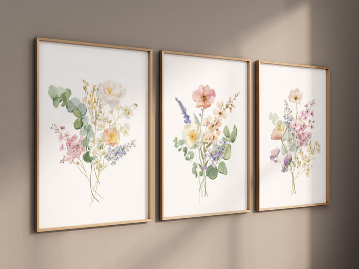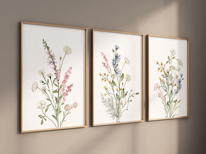 Wildflower Wall Art Set of 3 – Botanical Flower Prints in Soft Pastels – Neutral Floral Wall Decor for Bedroom, Nursery or Living Room