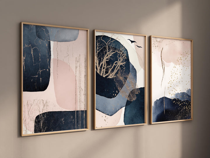 Navy and Blush Abstract Wall Art Set – Gold Accents Modern Boho Prints for Living Room, Bedroom, Office – Set of 3, navy blue and pink blush