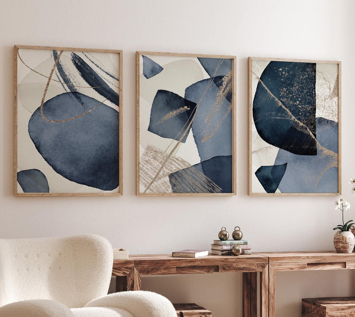 Blue Abstract Wall Art Set – Modern Navy and Gold Prints – Contemporary Minimalist Art for Living Room, Office, or Entryway Decor