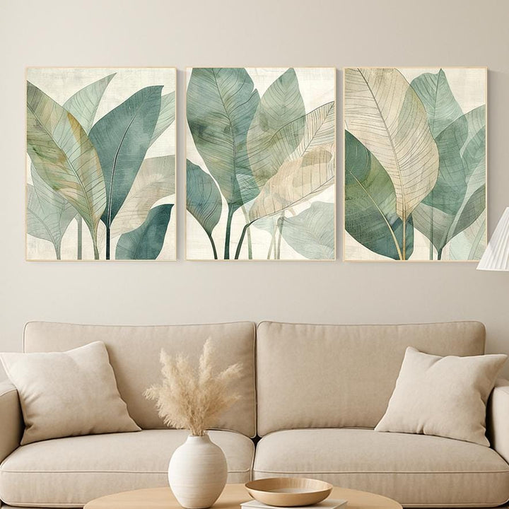 Tropical Leaf Wall Art Set – Neutral Green Botanical Prints for Living Room, Mid Century Modern Jungle Plant Decor (Set of 3)