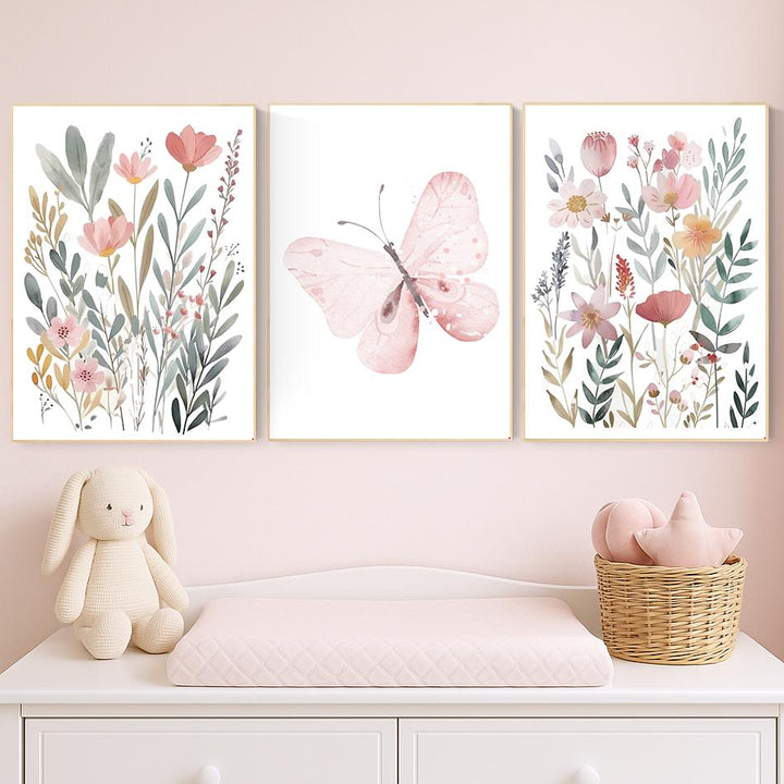 Butterfly Nursery Art Prints: Pink Floral Watercolor, Boho Baby Girl Decor