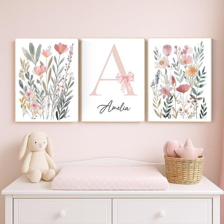 Personalized Floral Nursery Art Set: Baby Girl Room Decor with Pink Bow