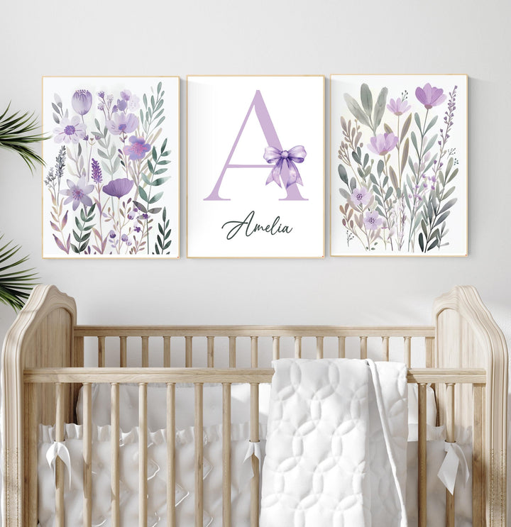 Lavender Floral Nursery Wall Art Set of 3 | Personalized Baby Girl Initial Print | Boho Purple Flower Name Artwork for Nursery Decor