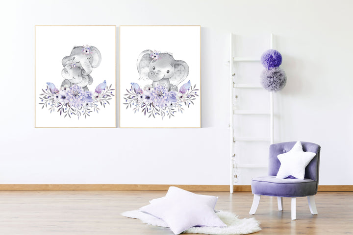 Purple nursery, Boho baby room, nursery wall art elephant, nursery decor girl, nursery decor girl floral, lilac nursery decor, lavender
