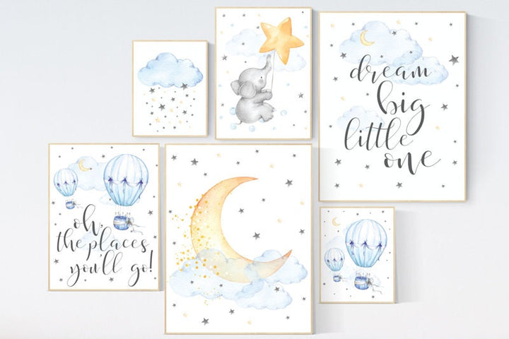 Nursery decor elephant, blue and yellow, gender neutral, dream big little one, nursery wall art neutral, hot air balloon, cloud and stars