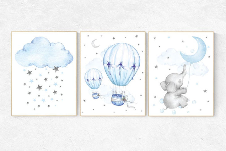 Nursery wall art elephant, Nursery decor boy hot air balloon, blue and gray, baby room decor, nursery prints, baby room wall art cloud stars