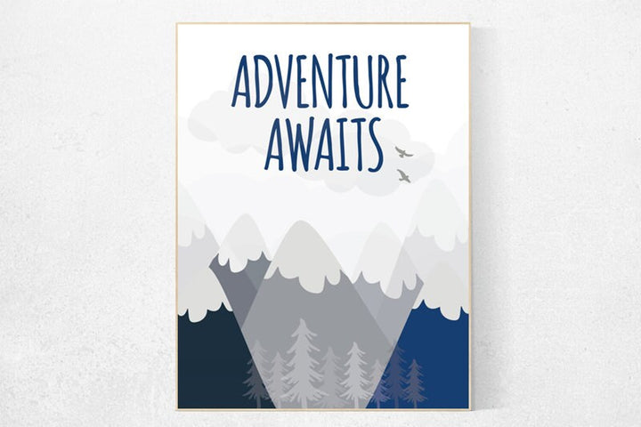 Woodland Nursery Decor, Baby Boy Nursery, Mountain Nursery, Adventure Awaits Print, Nursery decor boy, woodland nursery, navy gold