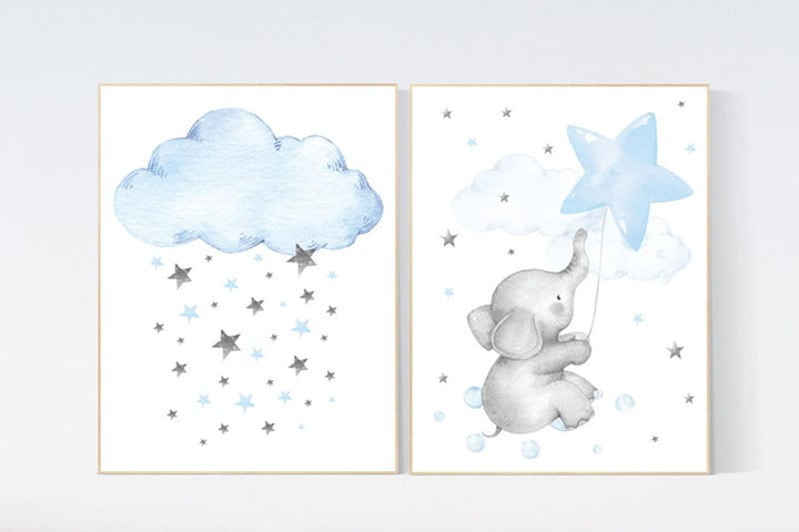 Nursery decor boy elephant, nursery wall art elephant, baby room decor boy, cloud and stars, Elephant Nursery Art, boy nursery decor