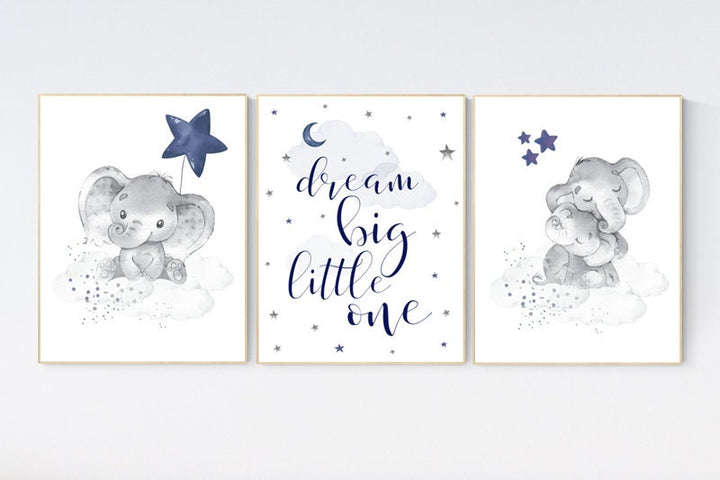 Nursery decor elephant, navy nursery decor, dream big little one, moon and stars, navy blue nursery art. baby room art, elephant nursery