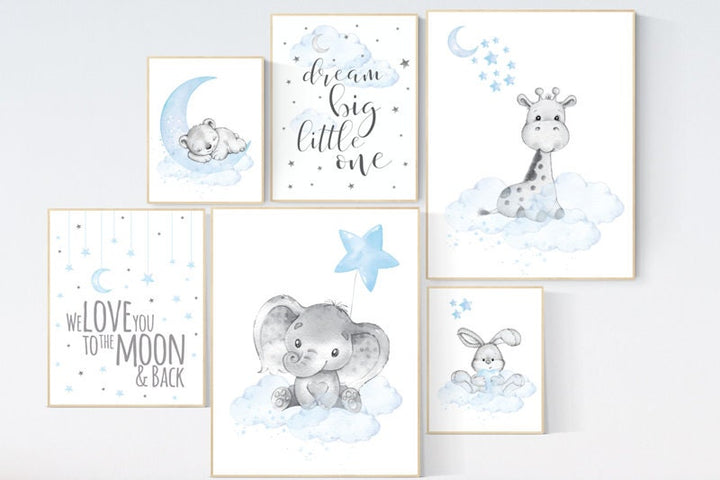 Nursery decor boy elephant, giraffe, boy nursery decor, moon and stars, blue nursery, boy nursery wall art, we love you to the moon and back