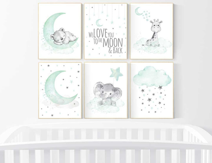 Nursery wall art gender neutral, nursery decor neutral, mint green, bear, giraffe, elephant, twin nursery, animal prints, mint green