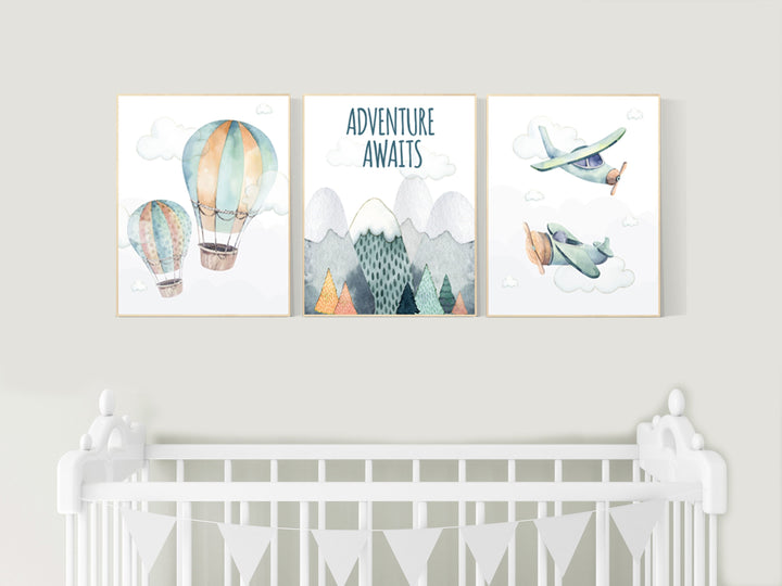Nursery decor boy mountain, adventure nursery, travel theme nursery, woodland, gender neutral, adventure awaits, hot air balloon, plane