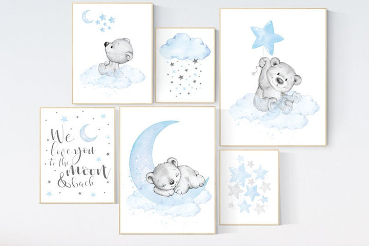 Nursery decor bear, nursery wall art boy, Blue grey, cloud and stars nursery, bear nursery art, moon nursery art, baby room wall art