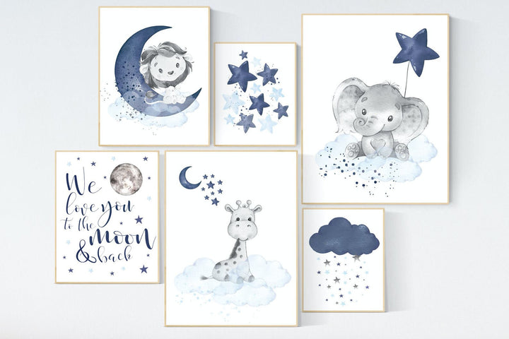 Nursery decor boy animals, giraffe, lion, elephant, boy nursery decor, moon and stars, navy and blue nursery, boy nursery wall decor