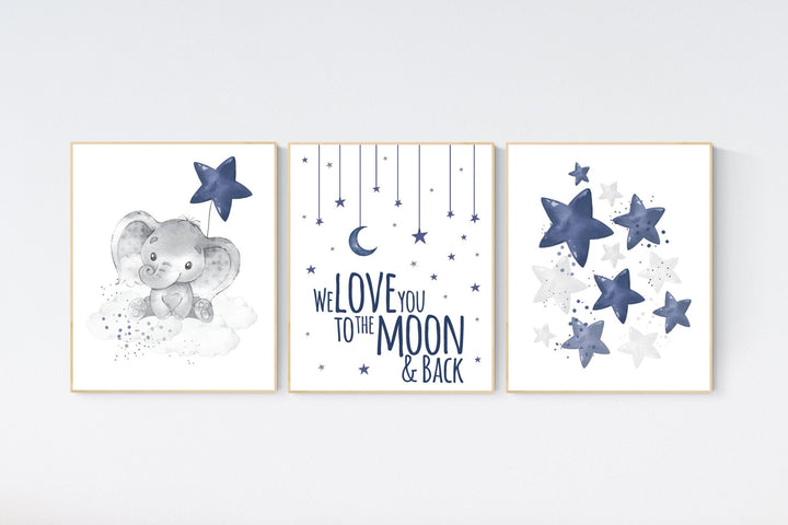 Nursery decor elephant, navy nursery decor, we love you to the moon and back, moon and stars, navy blue nursery art, elephant nursery art